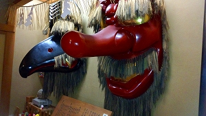 巨大天狗のお面、一本歯の高下駄や大きな太鼓等々 異空間ですな!