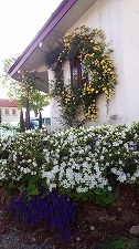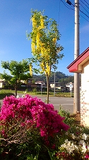 クレッシュの黄モッコウ、白ツツジ、紫のアジュガ うっとりです(笑)
