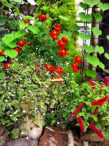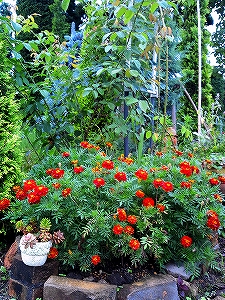 クレッシュの庭 バラのアーチの両側のマリーゴールド いきいき!
