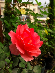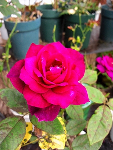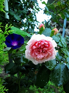 バラと朝顔仲良く~ 多肉もたっぷり水を含んでますね~