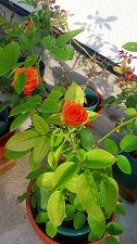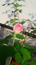 カンカン照りのテラスではひょろひょろのバラががんばっております