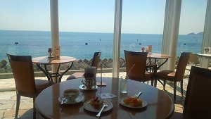 海の見えるJTBラウンジでコーヒーとケーキをいただきながら