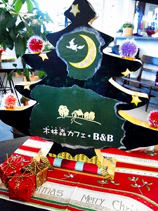 表はスノーマンの絵を張り付けて、裏はちゃっかり木林森カフェのロゴを入れてコマーシャル!!