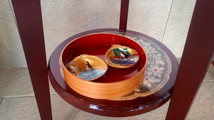 貝殻に施した正月らしいデコパージュと一緒に