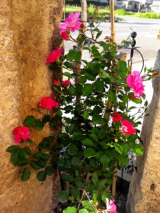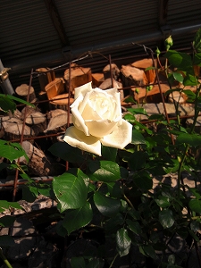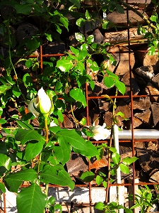 薪小屋の所の「新雪」が咲き始めました~ 朝日にあたって輝いています