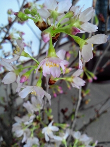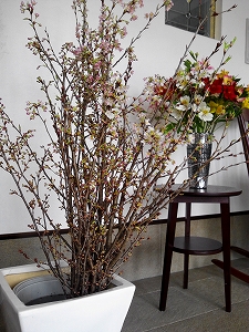 カフェの入り口にたくさんの桜の枝をいただいて、バケツのまま鉢カバーに入れました