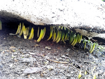 除雪で山のようになった雪の下でも水仙の芽が雪を押し上げているみたいですねぇ