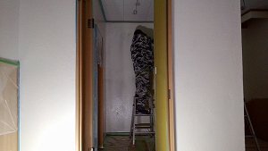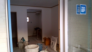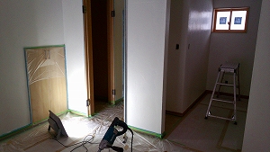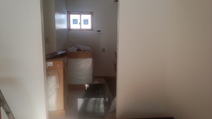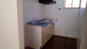 壁が塗られレンジフードやシンクの取り付けが行われています