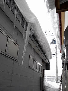 裏口からお隣との境を撮ってみました ツララもすごいし、屋根の雪が覆いかぶさって
