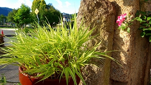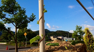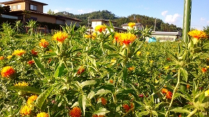 カフェと道路を挟んで反対側に小学校の紅花畑があります