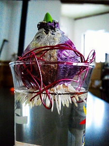 ヒヤシンスの球根をクネクネワイヤーで固定して