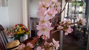 カフェの入り口には啓翁桜を飾って一足早く春の雰囲気に~~