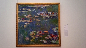 モネの睡蓮の前では数人の小学生がボランティアガイドさんの説明を聞いていました