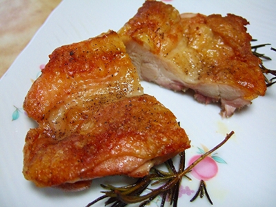カチンカチン冷凍の鶏肉に塩コショーとローズマリーをのせて
