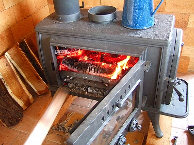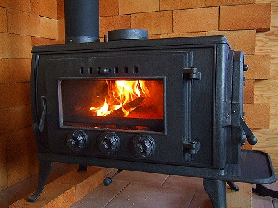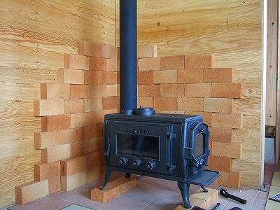 壁に耐火煉瓦を張り付けストーブを設置しました。