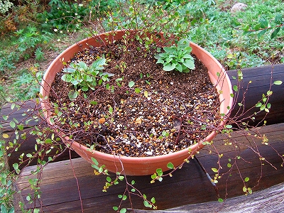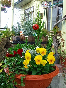 写真のビオラとワイヤープランツの鉢には真ん中にヒヤシンス、イキシア、アイリスを並べています。ちょっと寂しい感じなので春までバックヤードでおやすみ