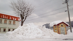 駐車場の除雪した雪はケヤキの木のところに集めて
