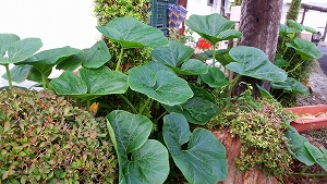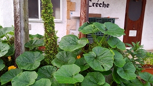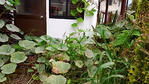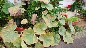 勝手にはえてきたカボチャですが植木を覆いつくすいきおいです