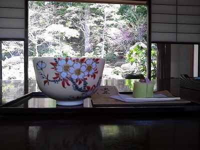 庭を眺めながらいっぷく 桜のお茶碗に桜のお菓子