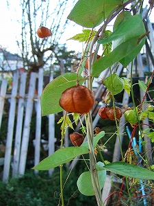 ふうせんかずらがハニーサックルとからみあってます