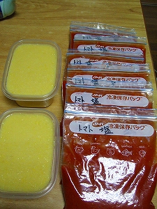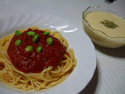 夕食はトマトソースのスパとコーンスープです(自給率たかい!!)