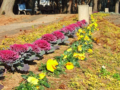 公園の葉牡丹やパンジーが日の光を一杯に浴びてる いいな~